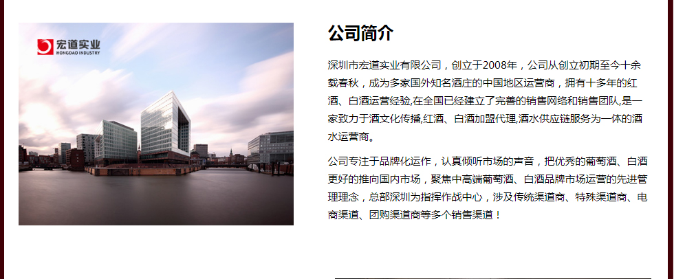 深圳市宏道实业有限公司,创立于2008年,公司从创立初期至今十余载春秋,成为多家国外知名酒庄的中国地区运营商,拥有十多年的红酒、白酒运营经验,在全国已经建立了完善的销售网络和销售团队,是一家致力于酒文化传播,红酒、白酒加盟代理,酒水供应链服务为一体的酒水运营商。