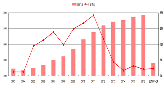 2003 年至今,尽管白酒产量逐年增长,但增速已明显换挡。除 2008 年因金融危机导致白酒产量增速下降外,2003-2011 年白酒产量呈现加速增长;2012-2014 年白酒行业三年寒冬期间,白酒产量增速持续下降至个位 数;2015 年至今白酒行业加速复苏,产量进入个位数增速阶段。2016 年,我国规模以上白酒企业完成酿酒总产 量 1358.36 万千升,同比增长 3.23%;2017 年 1-4 月,白酒产量为 444.40 万千升,同比增长 3.70%。