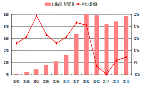 截至 2016 年末,规模以上白酒企业共 1578 家,其中亏损企业 113 家,企业亏损面为 7.16%。规模白酒企 业 2016 年共完成销售收入 6125.74 亿元,同比增长 10.07%;实现利润总额 797.15 亿元,同比增长 9.24%;亏损酒企共亏损 10.54 亿元,同比下降 15.92%。2015 年至今,收入和利润的加速增长印证了白酒行业复苏的趋势。