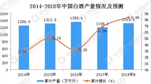 从近几年白酒产量的情况来看,白酒产量基本保持着稳定增长的态势。2013年—2016年间我国白酒产量在1300万千升左右,但2017年中国白酒产量呈现下滑趋势,2017年白酒产量在1198.1万千升,比2016年少160.3万千升,累计下滑6.9%。据中商产业研究院数据预测:预计2018年我国白酒产量达1318.6万千升。